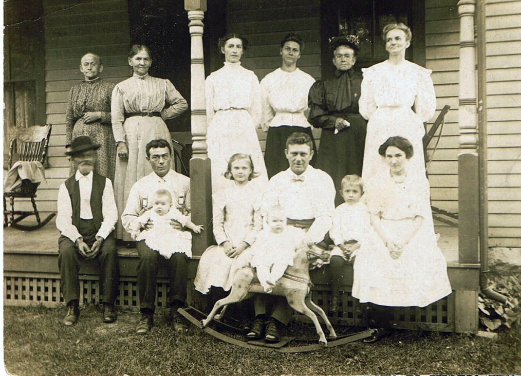 | Family Photo Top row: Carolina Birk, Louisa Klumpp, Hattie Snyder, Louisa Fairbanks, Sophia Snyder, Fanny Kelley. Children: Norman Snyder, Margaret and Ruth Fairbanks, Leo Snyder Sitting Adults: Chris Birk, Fred Snyder, Joe Fairbanks, Katherine Kelley |
