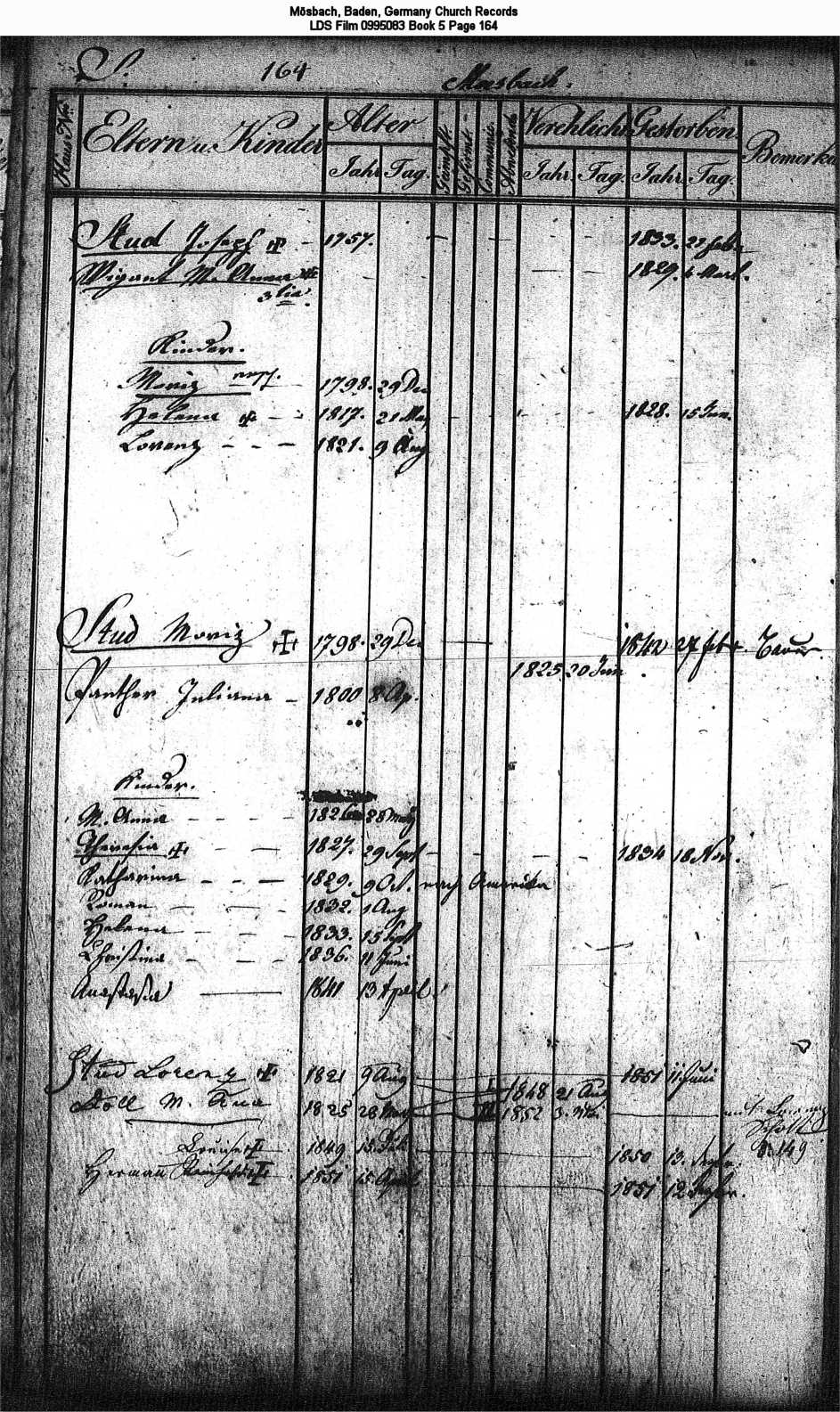 | Church Family Record 2 Mösbach, Baden, Germany Church Records LDS Film 0995083 Book 5 Page 164 |