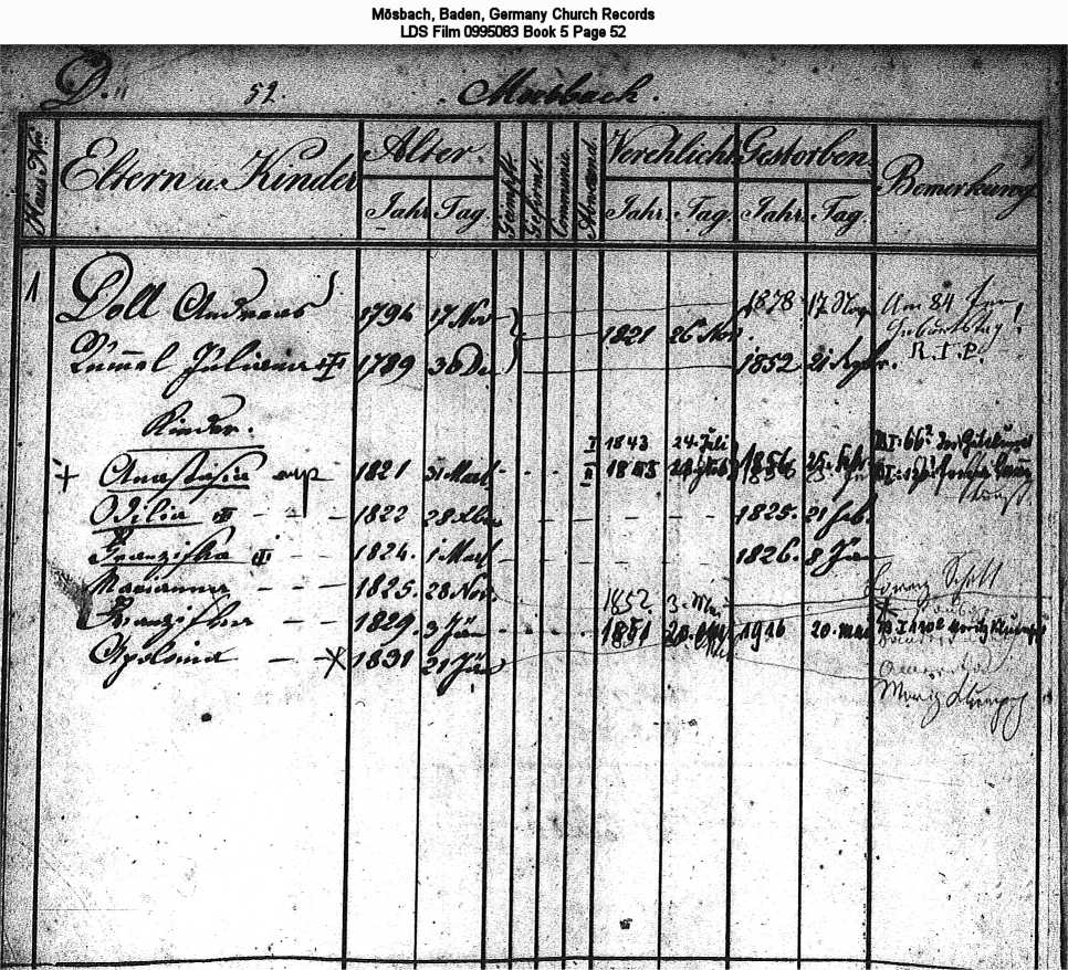 | Church Family Record Mösbach, Baden, Germany Church Records LDS Film 0995083 Book 5 Page 52 |