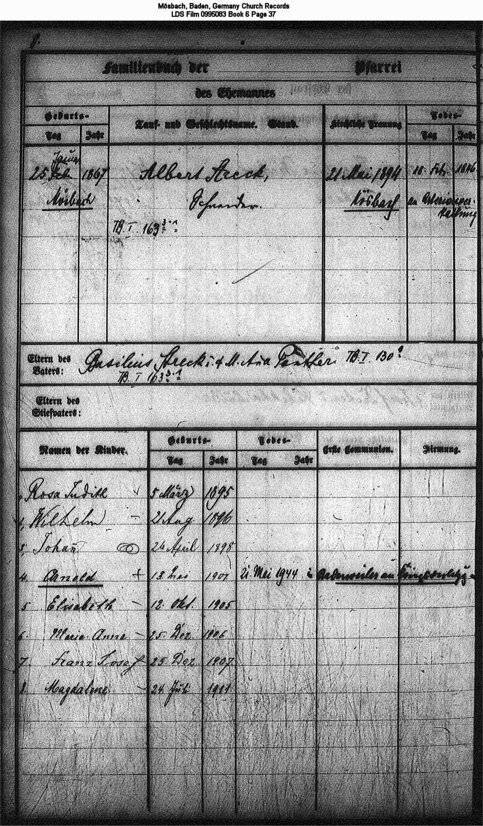 | Church Family Record 2 page 1 Mösbach, Baden, Germany Church Records LDS Film 0995083 Book 6 Page 37 |