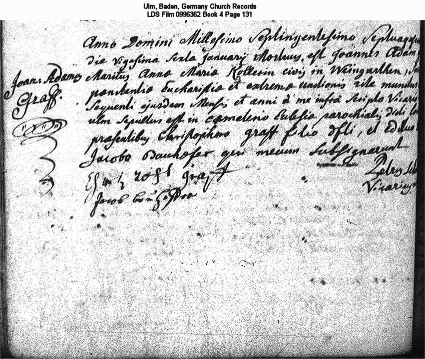 | Death Record Ulm, Baden, Germany Church Records LDS Film 0996362 Book 4 Page 131 |