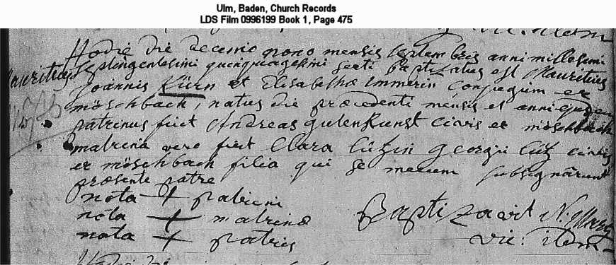 | Birth Record Ulm, Baden, Church Records LDS Film 0996199 Book 1, Page 475 |