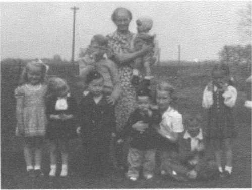 | Mary Ann and grandchildren c 1944 Back: Mary Ann, holding Paul, John Front: Carolyn, Anita, David, Mike, Gloria, Jim, Pat |