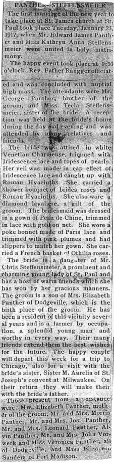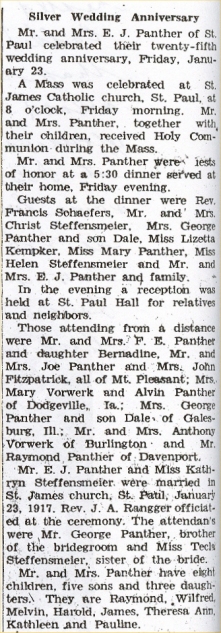| Edward Panther and Kathryn Steffensmeier Panther Family c 1938 Back L-R: Harold (Shorty), Melvin, James, Willfred (Bill), Raymond Front L-R: Theresa (Terry), Edward, Pauline, Kathryn, Kathy |