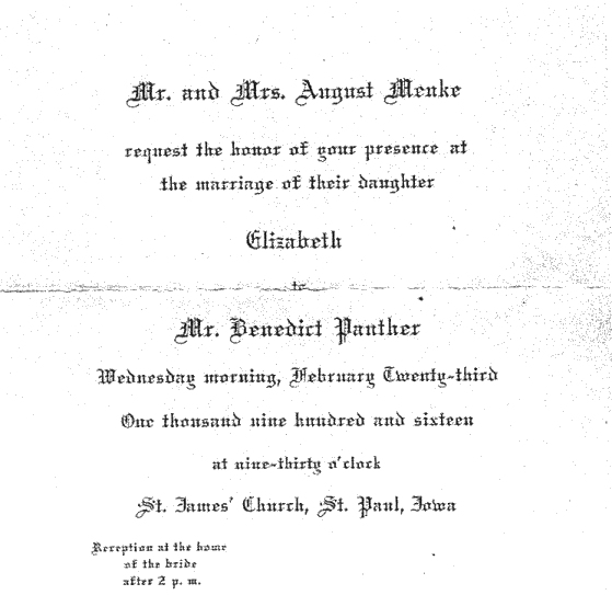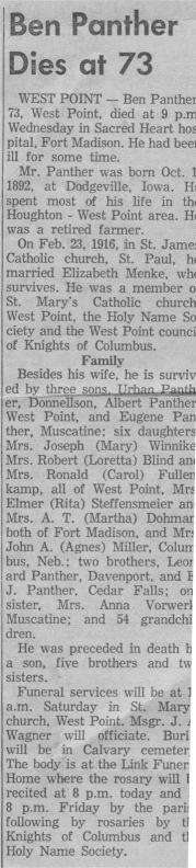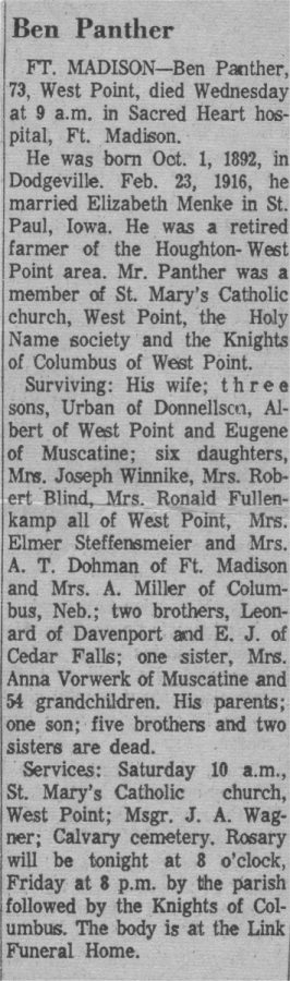 | Benedict and Elizabeth Panther and children F: Carol, Elizabeth, Benedict, Martha B: Loretta, Gene, Agnes, Albert, Rita, Urban, Mary |