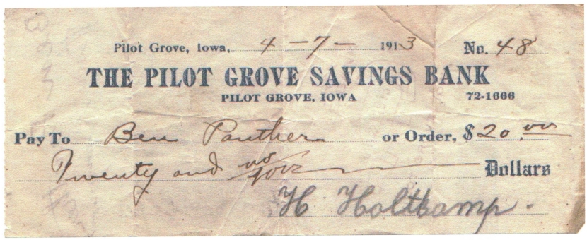 | Check from Henry Holtkamp This is a check Ben Panther received from Henry Holtkamp for labor (he was the hired man) before he and Elizabeth were married. Urban got this from Mark Holtkamp, Henry Holtkamp's grandson. |
