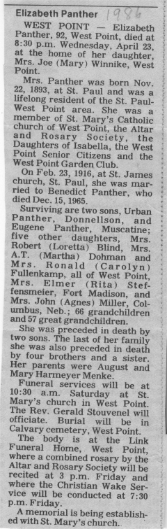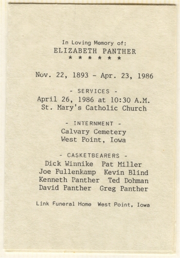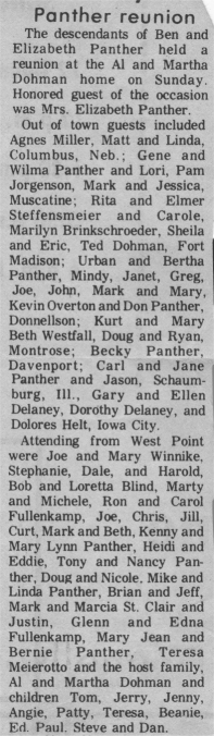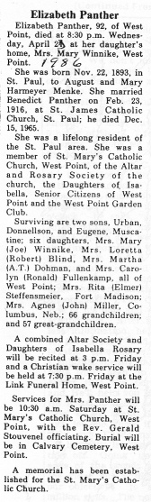 | Benedict and Elizabeth Panther and children F: Carol, Elizabeth, Benedict, Martha B: Loretta, Gene, Agnes, Albert, Rita, Urban, Mary |